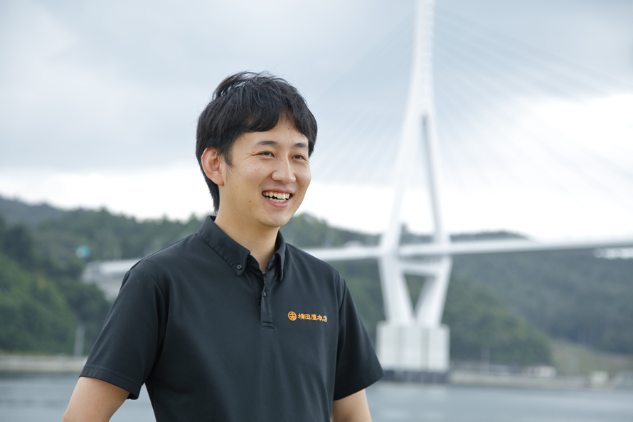 三陸沿岸道路の気仙沼港ICと浦島大島ICをつなぐ、気仙沼湾横断橋(愛称・かなえおおはし)。復興への歩みを象徴するこの橋のすぐそばに、株式会社横田屋本店の赤岩工場はあります。この真新しい工場でインタビューに応じていただいたのは、同社の13代目に当たる営業部課長の猪狩伸忠さんです。