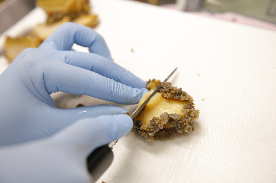 中村家では、このアワビをかたちが崩れないようにひとつひとつ丁寧に手切りし、手作業で美しく盛り付け。そこには島村さんの商品づくりへの想いが込められています。「たとえ遠方のお客様でも、カウンターからお出しする“料理”という感覚を大切にしています。そのために素材や調理には妥協せず、こだわりを持って作り続けています」。