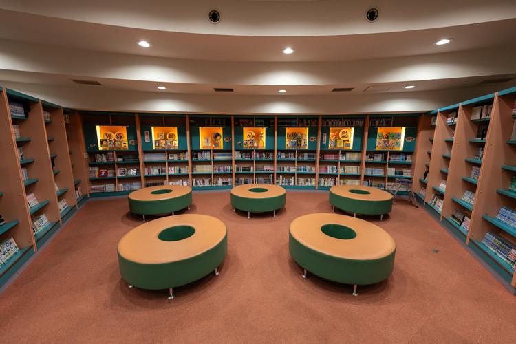 らせん状の館内の最上階には、マンガ家やマンガ愛好家の未来を育む空間が広がっています。左手には、開館を記念して描かれた人気漫画家たちの作品が並ぶアートウォールがあり、作画やアニメーションの制作・編集の仕組みを学ぶこともできます。また、6,000冊以上の蔵書を誇るライブラリーでは、マンガや関連書籍を自由に読むことができます。