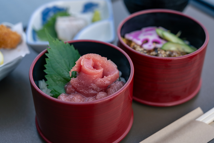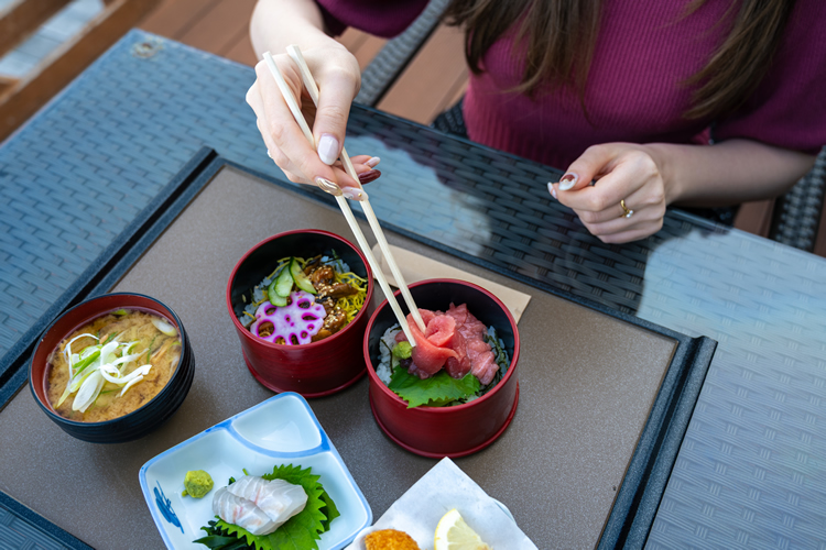 ここでは川沿いの席で、石巻ならではの味覚と海の幸を存分に味わうことができます。山徳平塚水産のさばの切り身を贅沢にのせた「さばだしラーメン」や、写真の「石巻元気御膳」など、季節ごとに内容が変わる多彩なメニューが揃っています。その時季の水揚げや収穫によって内容は異なりますが、地域の新鮮な魚介や旬の野菜、ふっくらと炊き上げたご飯が、丁寧な技とこだわりによって美しく仕立てられ、石巻の豊かな食文化を存分に味わうことができます。
