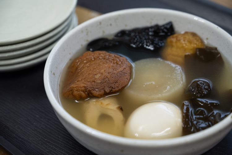 絆おでんは、地元の食材を中心に使用し、ゆで卵ややわらかな大根、手結び昆布、こんにゃくなど、具材を厳選。さらに、豊かな三陸の海で獲られて加工された焼きちくわが、石巻ならではの海の風味を添えています。かつお節と昆布から丁寧に取っただしは、化学調味料や保存料を一切使用せず、石巻の海の恵みと風土の魅力をそのまま味わうことができます。