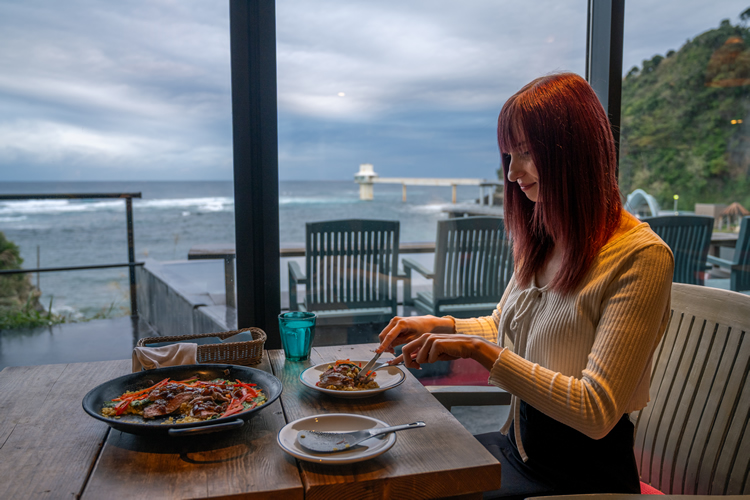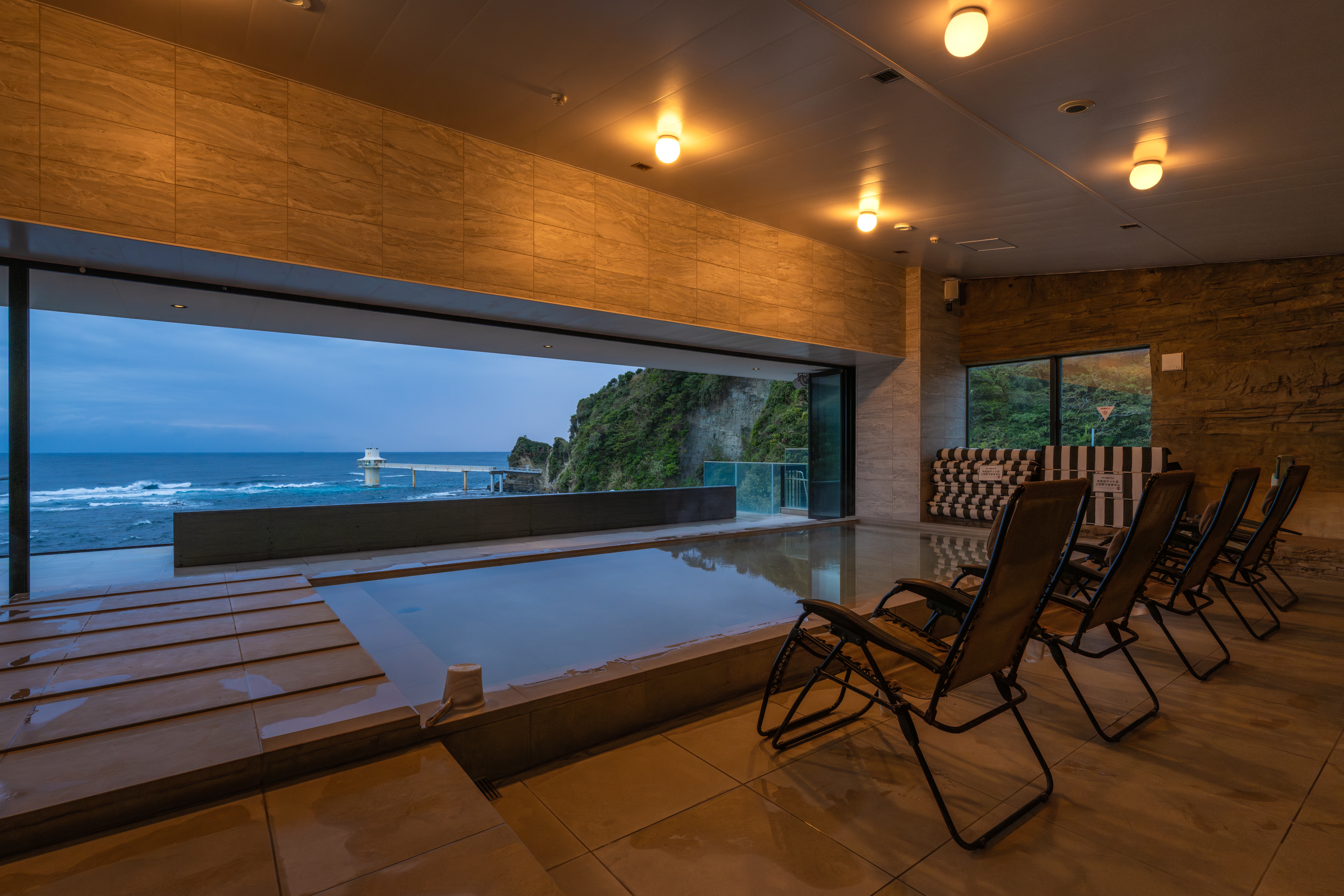 八幡岬公園で広がる海の景色を堪能した後は、ゆったりと過ごしながら勝浦の海岸の魅力を味わえるスポットへ足を運んでみましょう。岬から車でほど近く、また勝浦駅からは電車で鵜原駅まで移動し、そこから徒歩15分ほど。 edén RESTAURANT & SPAで は、断崖や歴史ある景観とは対照的な、洗練されたモダンな空間が広がるリトリートを楽しめます。