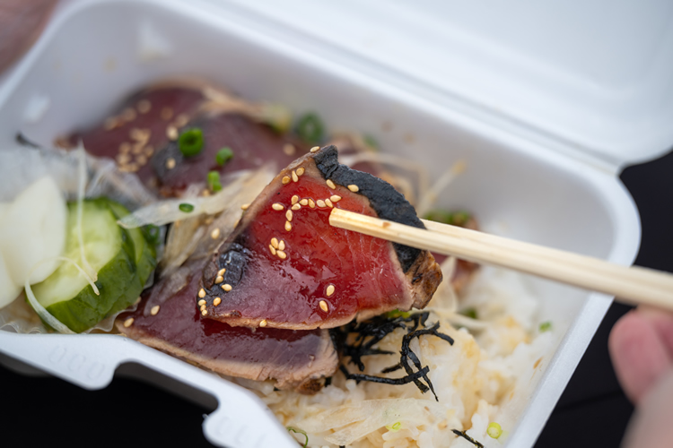 サラヤ保崎商店は、勝浦や周辺地域のコミュニティとの結び付きも強く、キッチンカーで地元イベントにも積極的に参加しています。キッチンカーでは、自社の素材を使った刺身や季節の海産料理が好評です。春や夏の祭り、市原市の地域イベント、そして毎年開催される「かつうらビッグひな祭り」などにも出店しており、初ガツオやキンメダイなどの旬の味覚は、来場者のおおきな楽しみの一つとなっています。