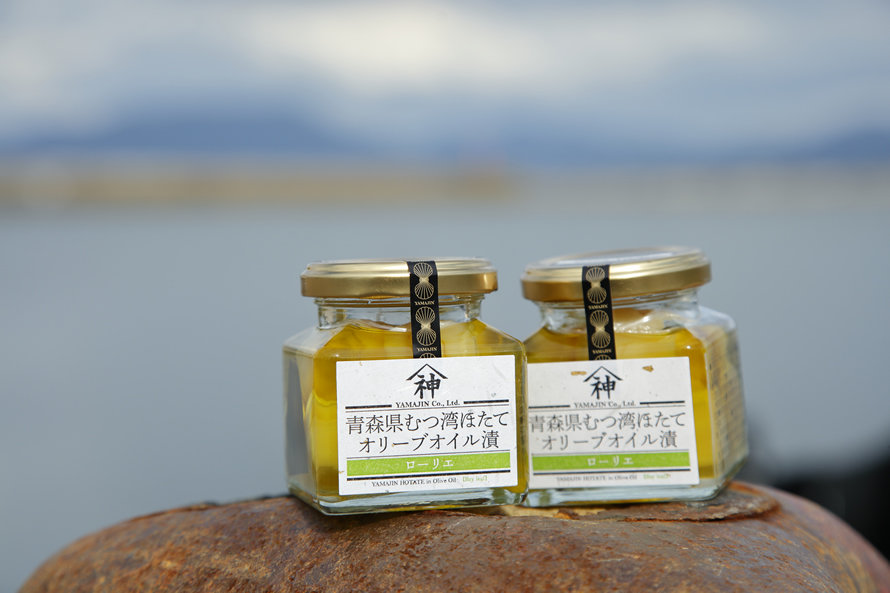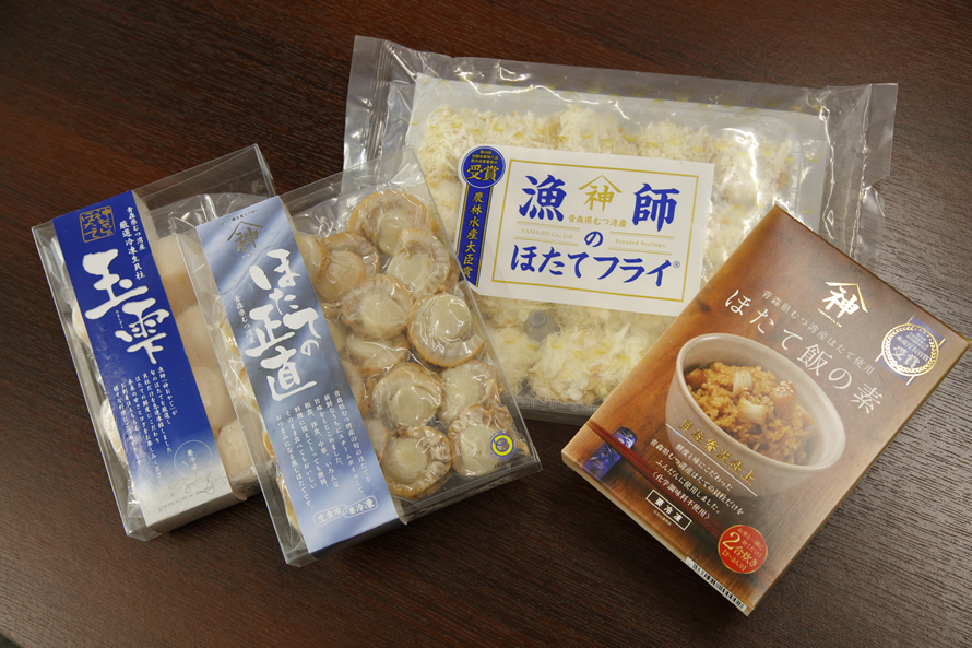 山神では、自慢のほたてを使った商品を多数展開。水揚げ当日にボイルと急速冷凍を行って旨味を閉じ込めた「ほたての正直」や、旬の時期のほたて貝柱をオリーブオイルに漬け込んだ「青森県むつ湾産ほたてオリーブオイル漬」など、手軽にそのおいしさを味わえる品が揃います。