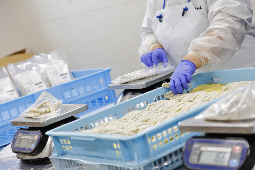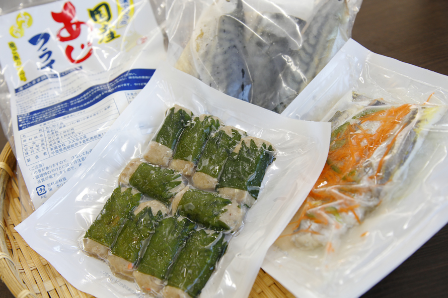 そう語るのは、社長の鈴木基進さん。この地で育ち、毎日のように味わってきた魚介のおいしさが、今の商品づくりにも活かされています。看板商品の「アジのさんが焼き」も、そのひとつ。房州の伝統的な漁師料理で、新鮮な真あじなどに玉ねぎと味噌をあわせ大葉を巻いて作る同社の商品は、道の駅などで販売されて人気を集めています。「ほかの地域の原料を使うこともありますが、基本的に本社工場の目の前にある千倉漁港や千葉県全域に水揚げされる魚にこだわって商品を作っています。最近では、衣が薄くてヘルシーなおいしさのアジフライも売れ筋です」。