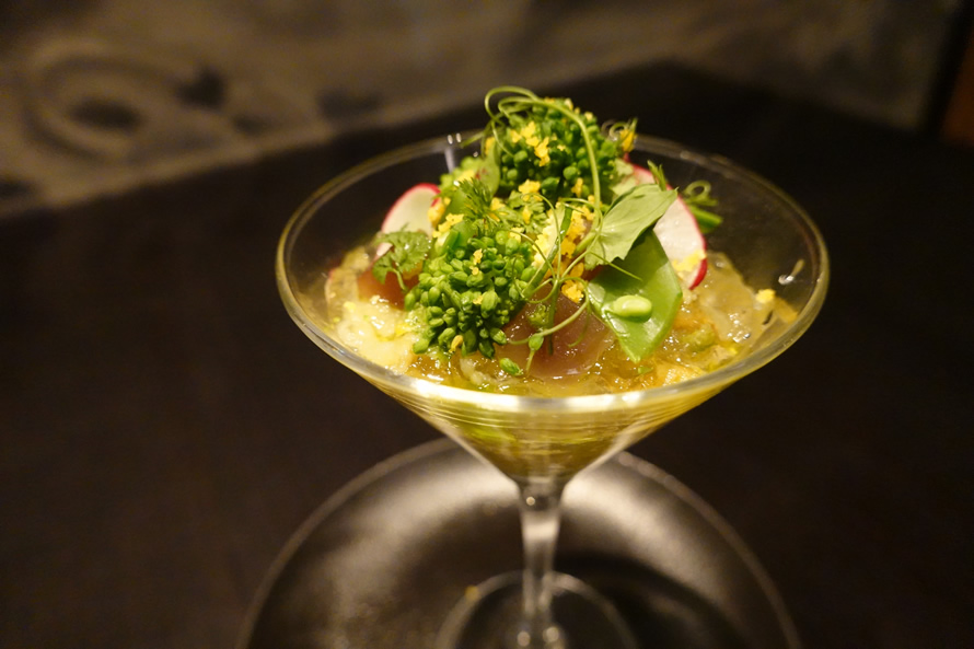 「気仙沼産 トロカツオのカルパッチョ ~菜の花と焼き茄子のタルタル~」