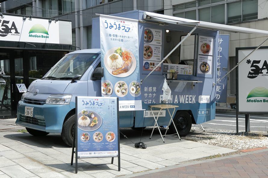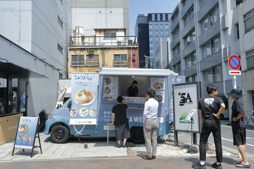 オフィス街を巡る「FISH A WEEK」のキッチンカーでも、三陸・常磐うみうまフェアの特別メニューを提供中です。キッチンカーでは魚料理はそのまま、ソースを入れ替えることも可能で、店舗とは異なるおいしさを楽しむことができます。