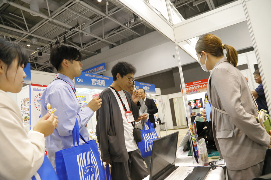初日のスタートは仙台国際センターで開催された「東北復興水産加工品展示商談会2025」から。会場には約130社の水産加工会社が集結し、各社自慢の商品を展示。参加者は気になるブースを巡り、商品を試食したり、生産者の話にじっくり耳を傾けていました。