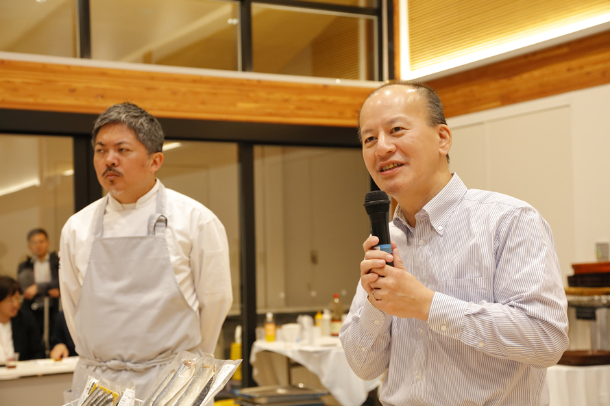 商談会の視察後は、仙台国際センターに隣接する仙臺緑彩館で意見交換・試食会が開催されました。各飲食店の代表者が挨拶を行った後、青森・岩手・宮城にある加工会社7社がプレゼンテーション。東京・六本木の完全予約制・紹介制レストラン「Peace Kitchen TOKYO」を経営する比嘉シェフ監修による、各社の商品を使った料理を味わいながら、商品の特徴や産地のストーリーなどにふれました。