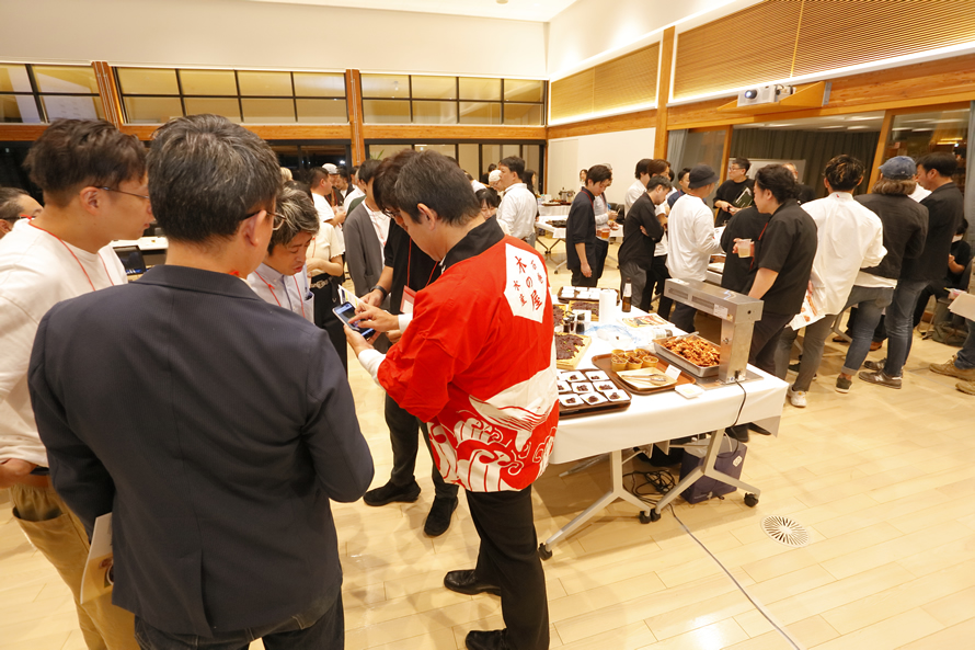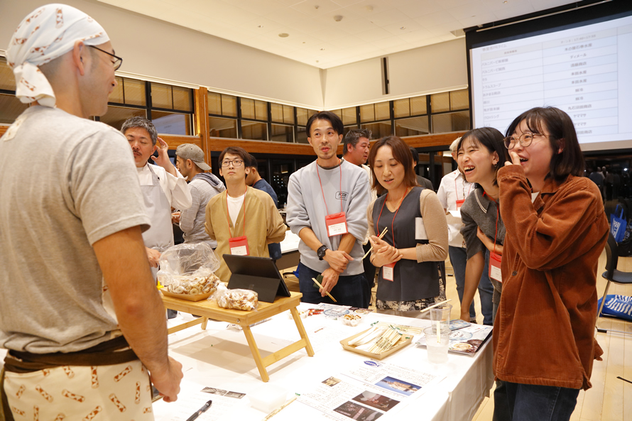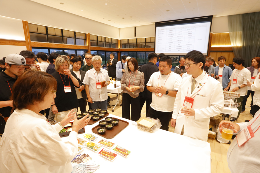 プレゼンテーションの後は、加工会社のPRタイムを含めた試食会を開催。参加者は加工会社のテーブルを巡り、料理を味わいながら生産者と交流。飲食店メニューへのアレンジ方法を相談したり、サンプルを依頼したり、活発なやり取りが繰り広げられました。