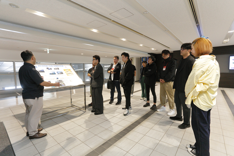 市場見学の後は、中澤水産有限会社の加工場へ移動。鮮魚出荷用のいけすやトラックを見学したり、ヒラメやタコなどの加工品について紹介を受けたり、実際に商品を手に取って質問を重ねたりと、商品の魅力をより深く知る機会となりました。