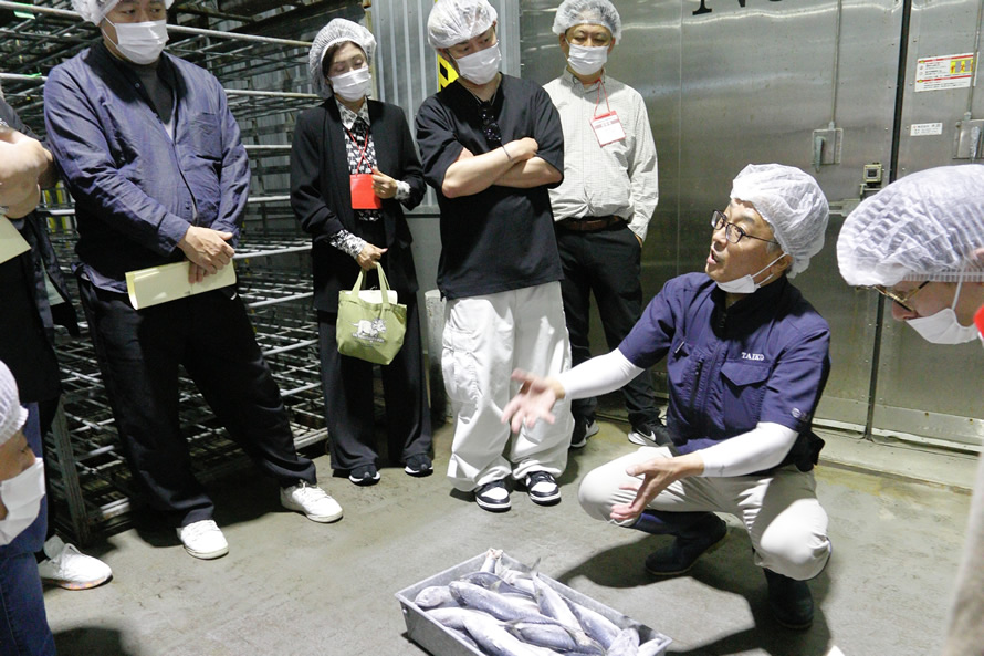 その後は、魚市場周辺に点在する水産加工会社3社の視察へ。大興水産株式会社では魚の選別工場や加工工場を回り、ひとつの商品が原料から加工、出荷されるまでの一連の流れを実際に辿りました。