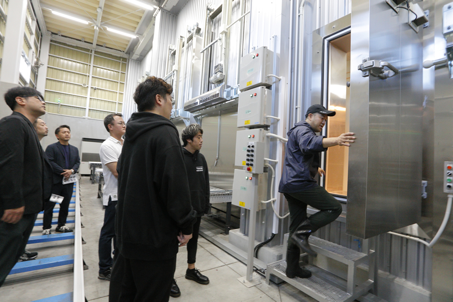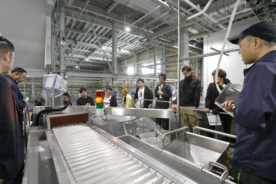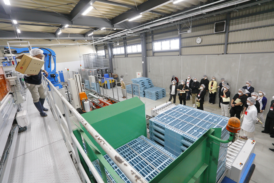 盛信冷凍庫株式会社では人材不足の解決を目指し、全国の加工会社の中でも先進的に取り組まれている工程の機械化・省人化の現場を見学。参加者は興味深そうに設備などの説明を聞いていました。