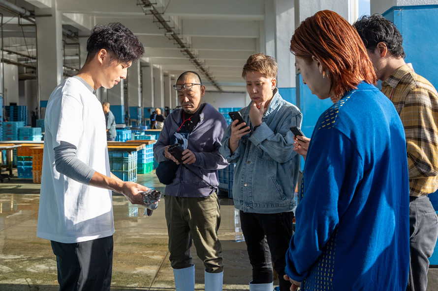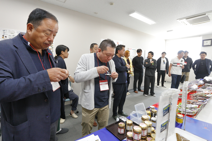 末永海産株式会社では看板商品「牡蠣の潮煮」をはじめ、多彩な加工品を試食。中には人生で初めてホヤを食べるという人も。さまざまな商品を味わいながら「この商品は店でこう出せそう」とアイデアを膨らませる姿が印象的でした。
