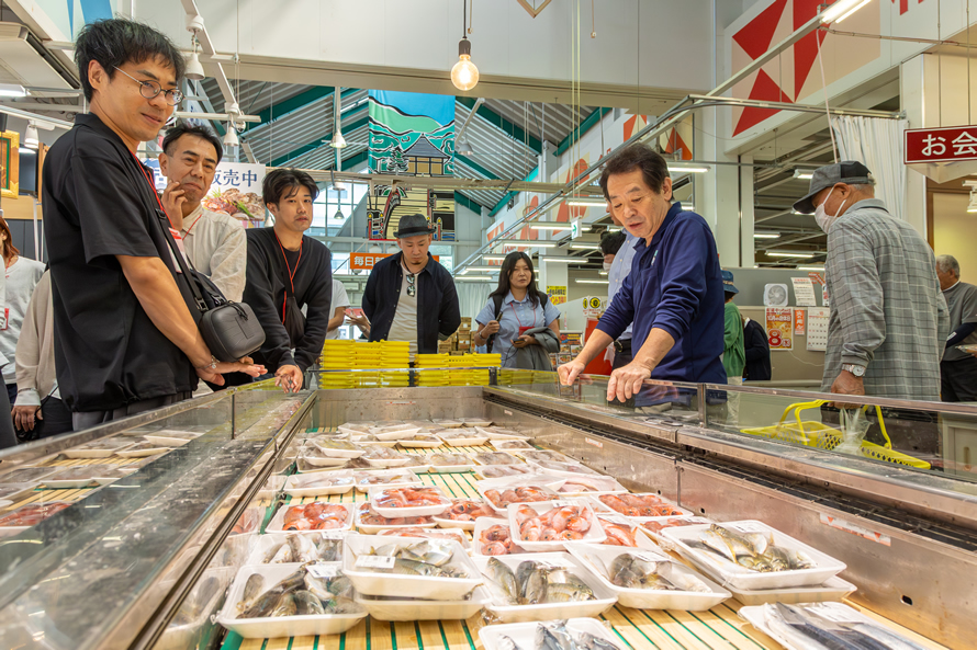 加工会社の見学後は旬の鮮魚や水産加工品、地域の特産品などがそろう観光商業施設「いしのまき元気市場」で、地元で人気の水産加工品を探したり、購入したお刺身を食べて旬の味覚を確かめたり、現地ならではの充実した時間を過ごしました。