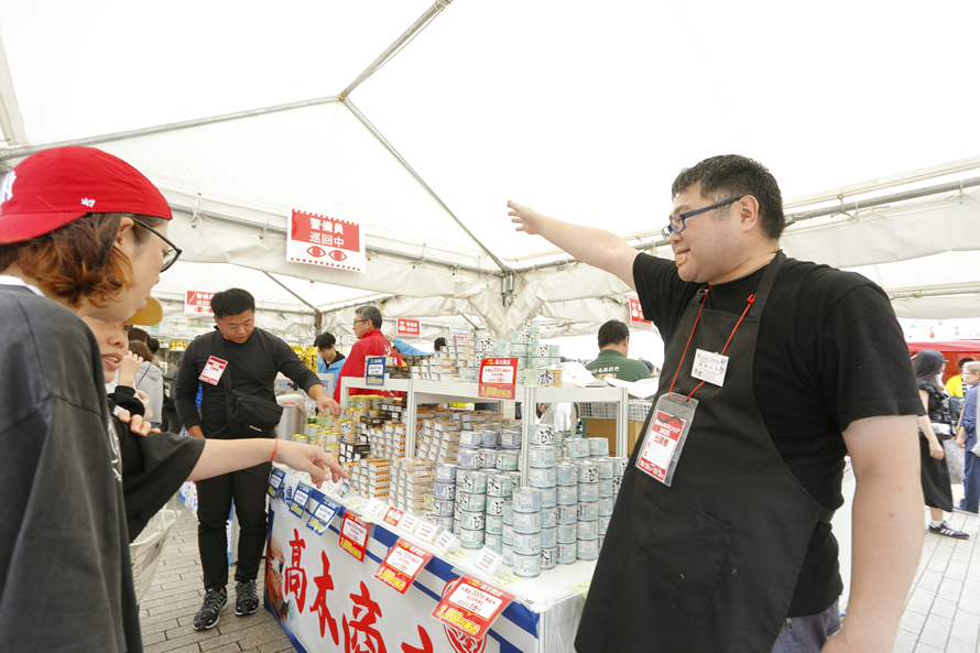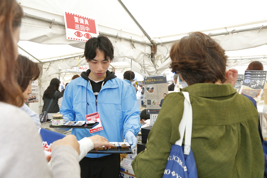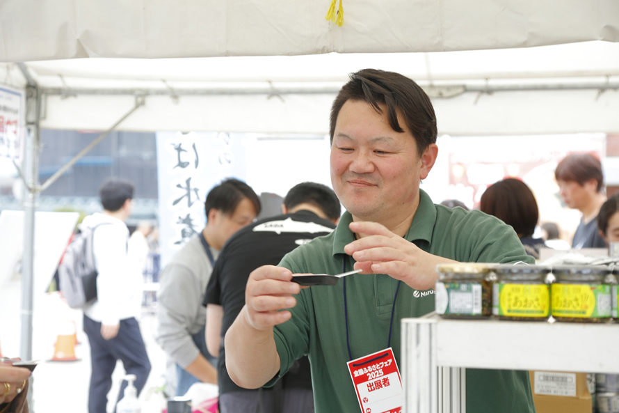 ブースの周りでは、参加した加工業者の皆さんが声を掛け、足を止めたお客さんに産地や素材について丁寧に説明していました。試食を手に取ったお客さんからは「おいしい!」といった声があちこちから上がり、ブースの前は、常に人だかりの状態。商品をじっくりと選ぶ姿や、レジに並ぶ長い列が印象的でした。